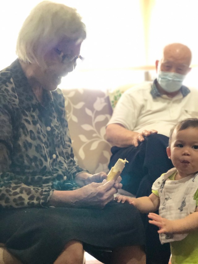 We had a lovely visit with my grandparents on Monday. Matthew was initially a bit apprehensive, but was immediately won over when my grandmother tempted him with a banana.