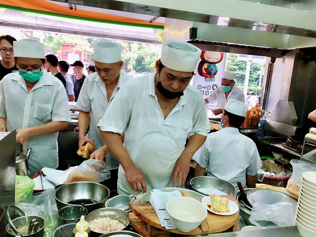 Saturday morning we drove to one of the most popular Taiwanese breakfast spots (as we were told) in Taipei. Like most traditional Taiwanese breakfast joints, the place had an open kitchen with a small inside eating area and a few tables on the sidewalk. Inside the kitchen, which is no bigger than a one-car garage, four or five chefs and staff are busy taking and assembling orders as well as cooking. The man who takes your order and money yells out the food items needed for another man to assemble also makes the drinks. Though it feels very chaotic, the process is actually rather efficient and the chemistry among the staff is palpable.